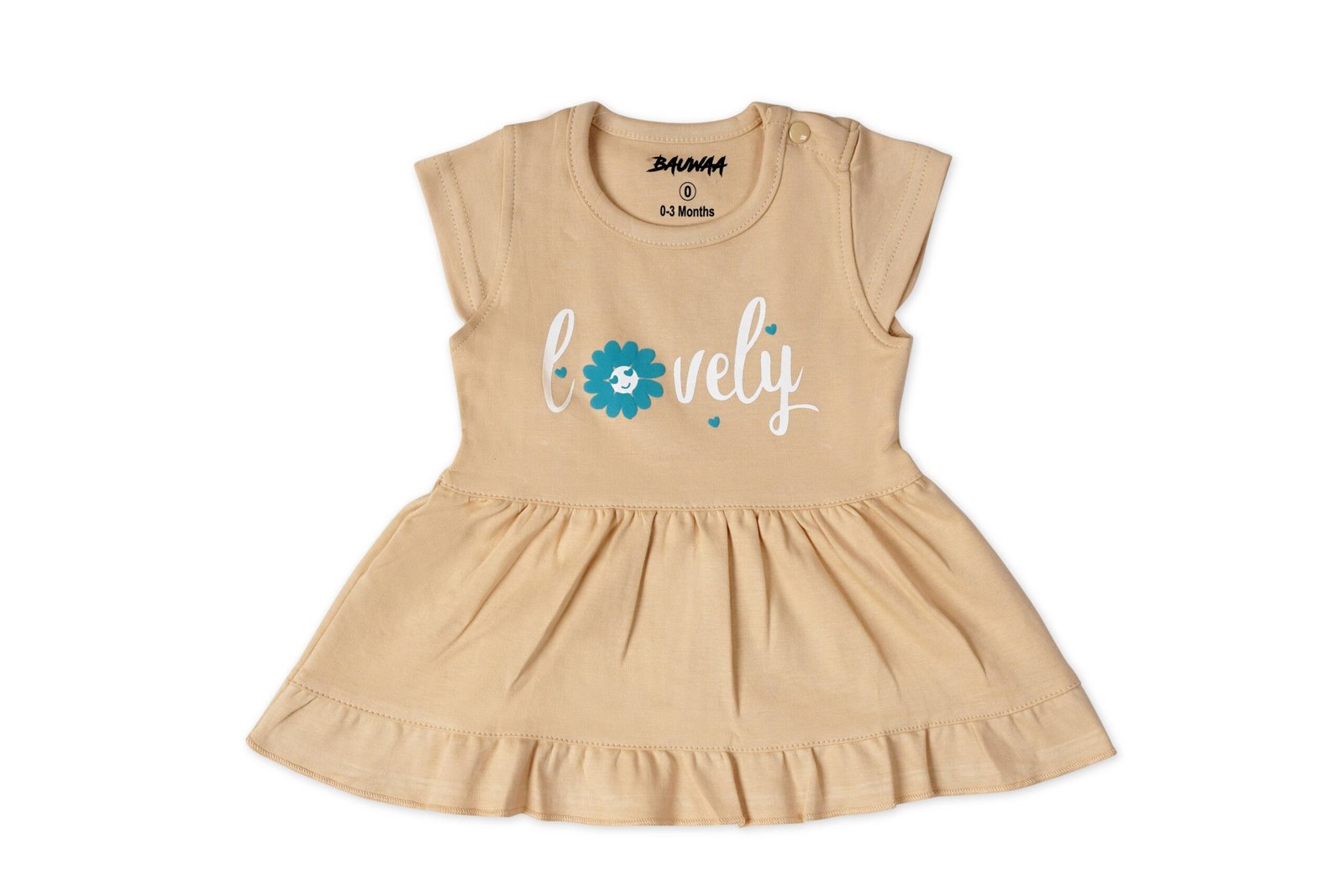 Dress your little princess in comfort and charm with the BAUWAA Baby Girls’ Cotton Frock. Designed for babies aged 0–3 months, this frock is made from 100% soft cotton, ensuring it is breathable, lightweight, and gentle on delicate skin. Featuring a sweet “Lovely” print with floral design, sleeveless style, and a flared bottom, it’s perfect for both daily wear and special outings.